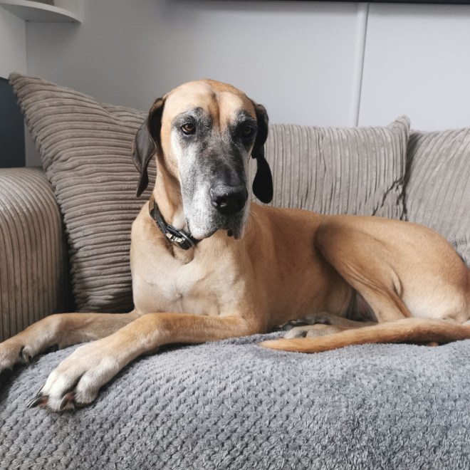 In my intro, I mention that my husband is always pushing me to try new things… This was my first experience of that. He held her collar as I came in and until I got my feet up on the sofa; but then let her roam free! If I’m honest, I was annoyed! But true to his word, she didn’t hurt me, nor did she put a foot wrong due to his time and effort in training this clever pup.